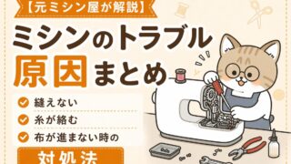 【元ミシン屋が解説】ミシンのトラブル原因まとめ|縫えない・糸が絡む・布が進まない時の対処法ミシンが縫えない、糸が絡む、布が進まないなどのトラブルは、原因を知れば自分で直せることがほとんどです。元ミシン屋がミシンのよくあるトラブル原因と直し方をまとめて解説。初心者でもチェックできるポイントをわかりやすく紹介します。...