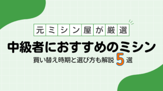 【元ミシン屋が厳選】中級者におすすめのミシン5選|買い替え時期と選び方も解説初心者ミシンに物足りなくなってきた中級者向けに、元ミシン屋が2〜10万円台のおすすめミシン5台を厳選。買い替えのタイミング・押え圧調節など必要な機能・ジャノメ/ブラザー/JUKIの比較まで徹底解説。...