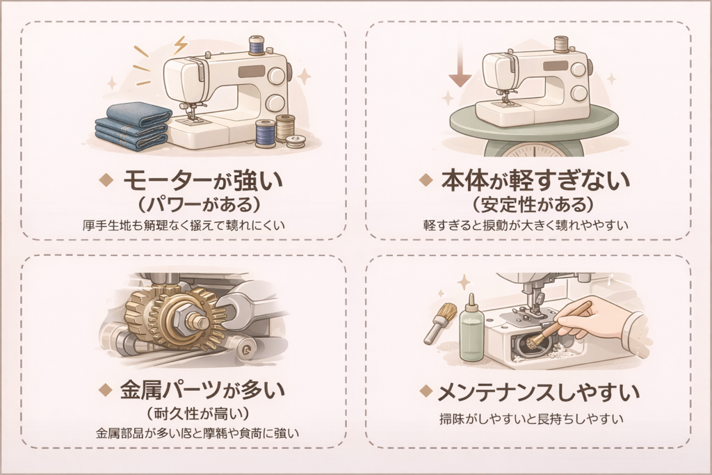 一方で、耐久性の高いミシンは金属パーツが多く、摩耗や負荷に強い設計になっています。