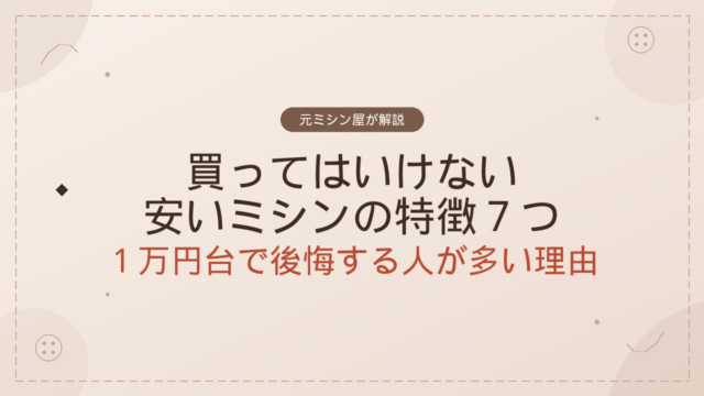 ミシン選び方・おすすめ買ってはいけない安いミシンの特徴7つ|1万円台で後悔する人が多い理由を元ミシン屋が解説 2026-04-14 けい 「安いミシンで十分かな」そう思って1万円台のミシンを買ったあとに、まっすぐ縫えない糸がぐちゃぐちゃになる厚いとこ …